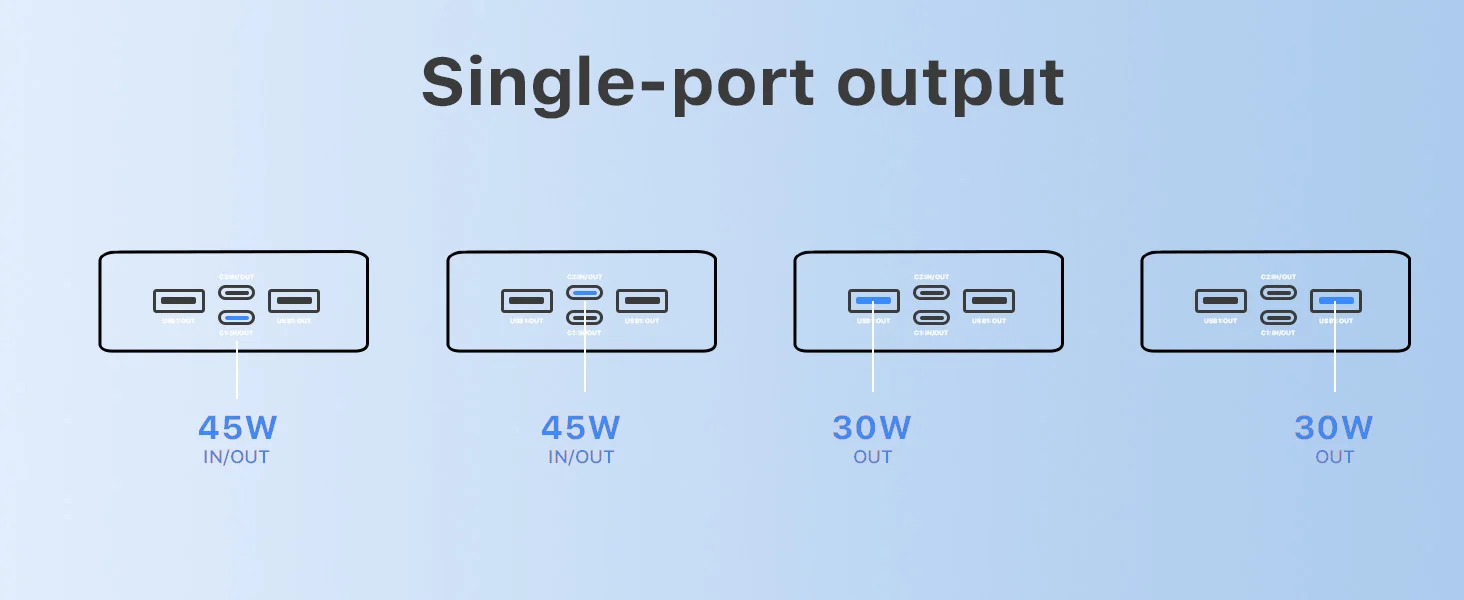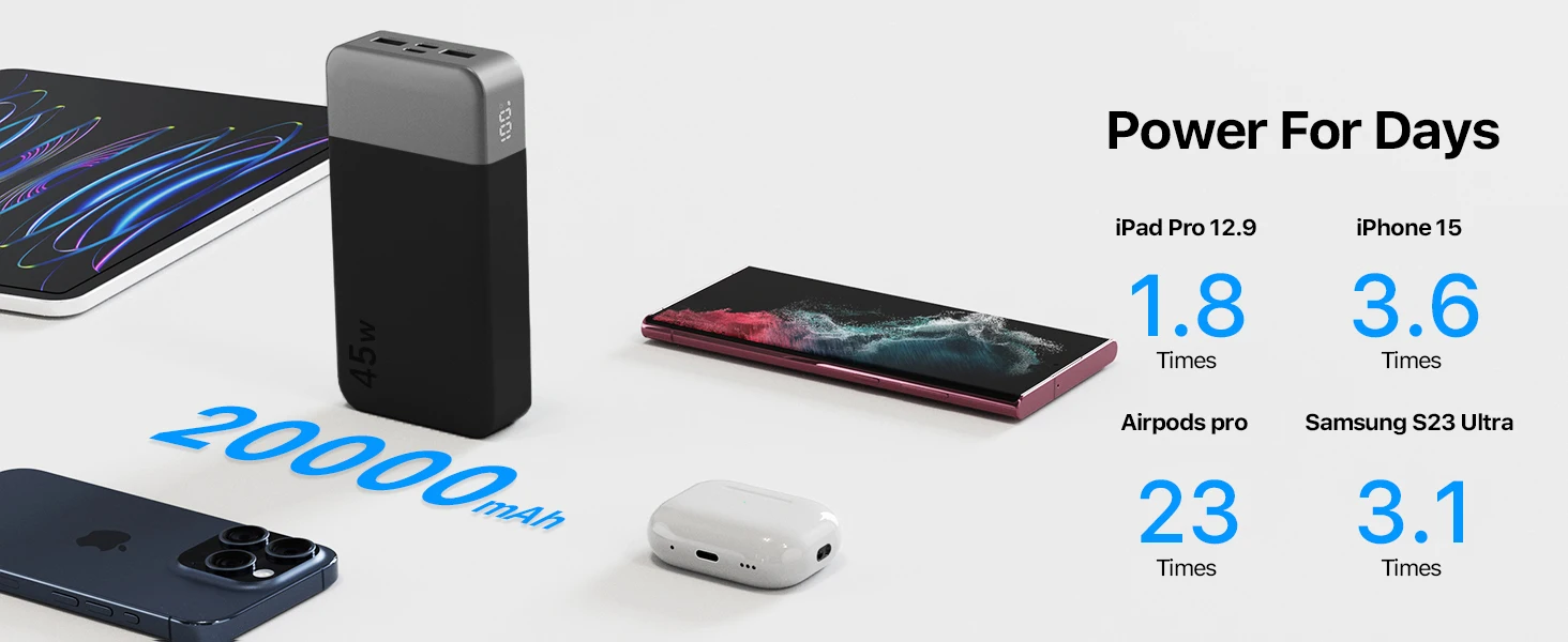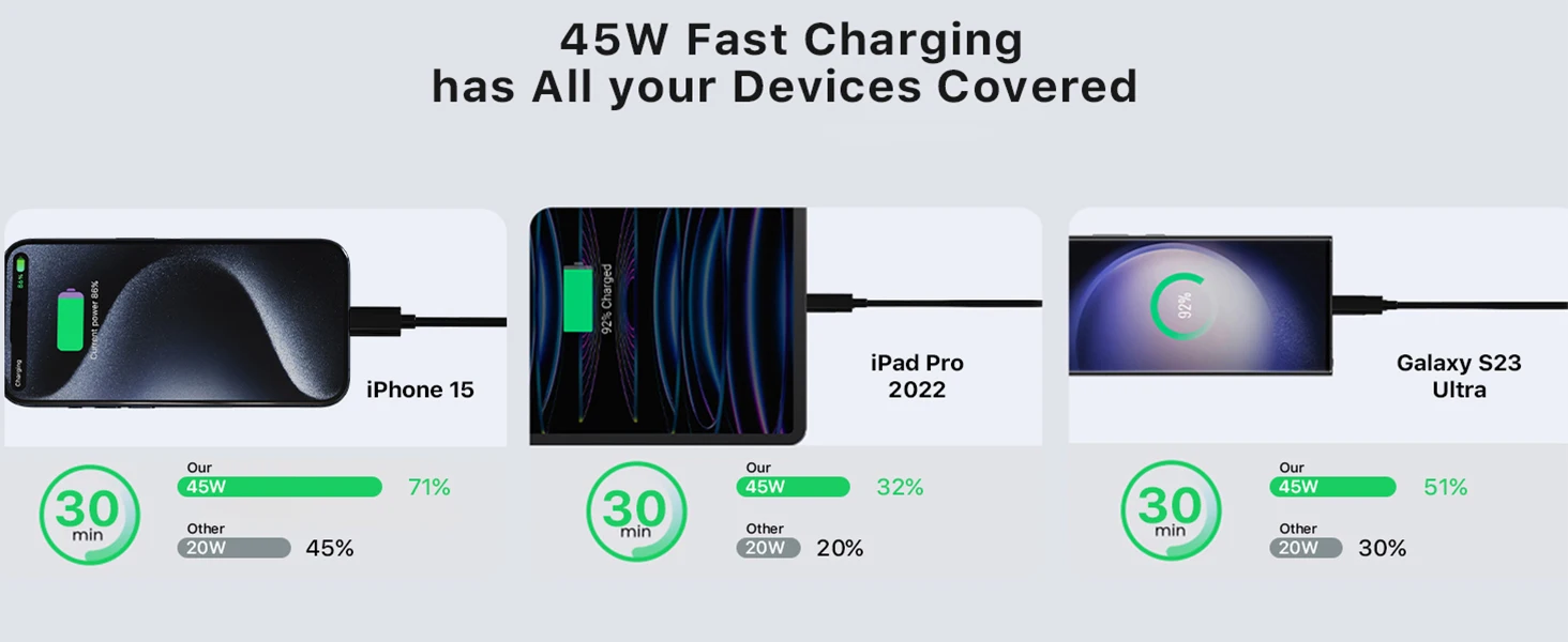 【Wide Compatibility】45W portable charger Perfectly Compatible with Samsung,Android ect. smartphone, tablet laptops, mini speakers, Bluetooth headsets, cameras, handheld game consoles and other USB electronic devices,small current devices such as for Airpods. multiple modes can be switched freely.