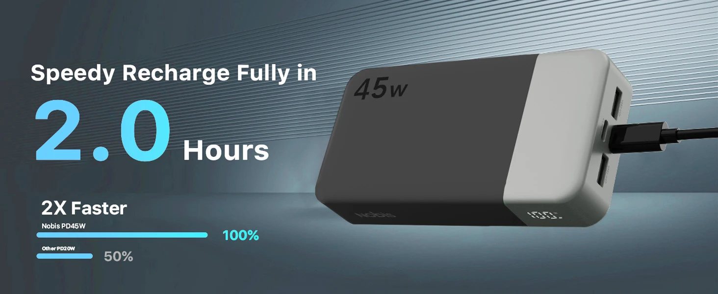 【Two-way fast charging】NOBIS power bank with 4 Outputs & 2 Inputs quick recharge ports. It only takes 2 hours to full charge power bank by Type c input port.NOTE:Recharging battery pack fully in 2 hours need a 45W PD charger or above, charger is not included.
